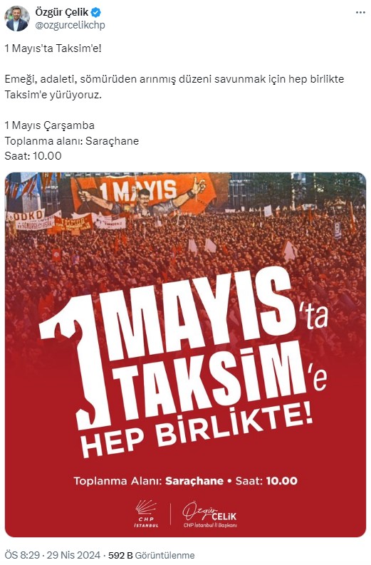 CHP İstanbul İl Başkanı Özgür Çelik, “1 Mayıs’ta Taksim’e! Emeği, adaleti, sömürüden arınmış düzeni savunmak için hep birlikte Taksim’e yürüyoruz” paylaşımıyla çağrıda bulunuyor dedi.