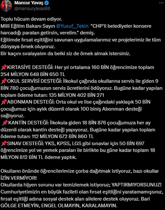 Ankara Büyükşehir Belediye (ABB) Başkanı Mansur Yavaş, öğrencilere yönelik beslenme desteği önerisi üzerine, Milli Eğitim Bakanı Yusuf Tekin’in “CHP’li belediyeler konsere harcadığı paraları getirsin, verelim” açıklamasına sosyal medyadan yanıt verdi.