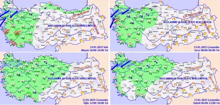 Ülkenin iç ve doğu kesimlerinde buzlanma ve don ile birlikte pus ve sis bekleniyor. Ayrıca Doğu Karadeniz’in iç kesimleri ile Doğu Anadolu’nun yüksek ve dik yamaçlarında çığ tehlikesi bulunduğu ifade edildi.
