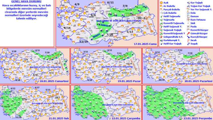 Yurdun iç ve doğu kesimlerinde buzlanma, don, pus ve yer yer sis hadisesi öngörülürken, Doğu Karadeniz’in iç kesimlerinin yüksekleri ile Doğu Anadolu’nun dik ve yüksek yamaçlarında çığ tehlikesi bulunduğu uyarısı yapıldı.