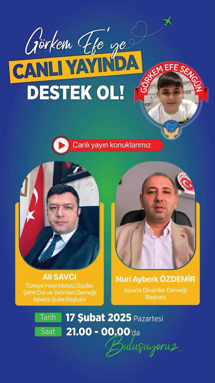 Görkem Efe’ye destek olmak için düzenlenen canlı yayında Ali Savcı’nın yanı sıra Isparta Dinarlılar Derneği Başkanı Nuri Ayberk Özdemir de konuk olacak. Bu akşam 21.00’de başlayacak yayın, gece yarısına kadar sürecek. Destek vermek isteyenler, dmd.gorkemefe Instagram hesabı üzerinden yayına katılabilecek.