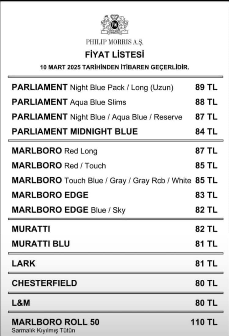 Geçtiğimiz hafta birçok sigara üreticisi fiyat güncellemesi yaparken, P.M. grubunun da zam kararı aldığı açıklandı. Erol Dündar, sosyal medya hesabından yaptığı paylaşımda 10 Mart itibarıyla geçerli olacak yeni fiyat listesini kamuoyuyla paylaştı.